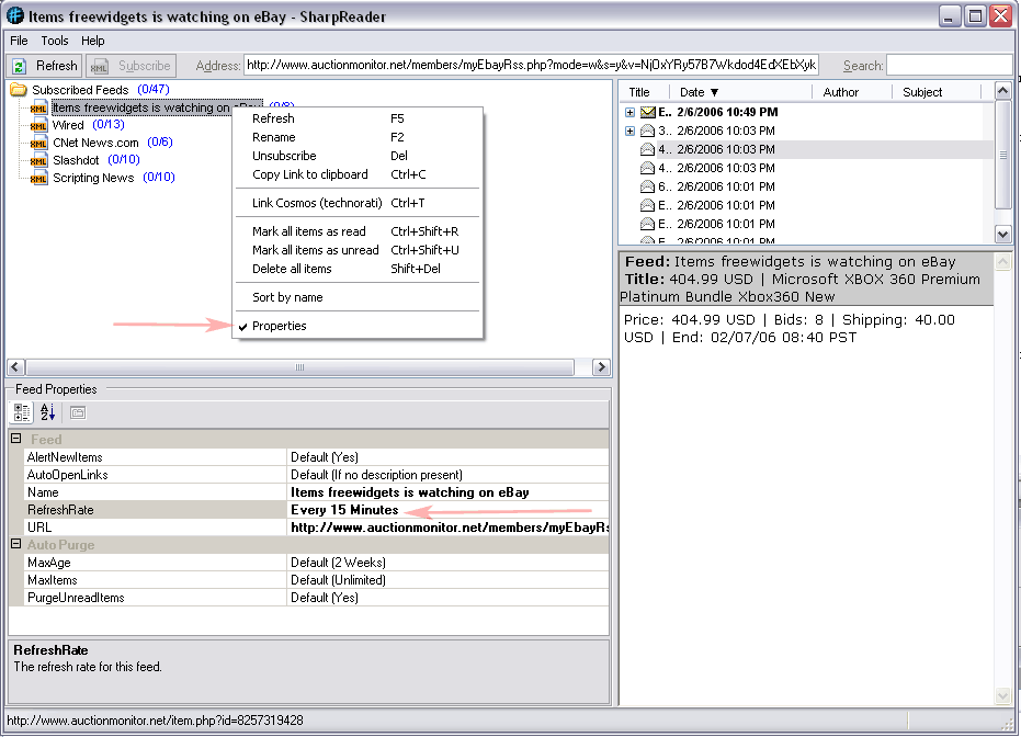 Paste this link into the "Address:" bar we found earlier. Push enter to preview the content, then click Subscribe when you are satified with the content. As long as you keep the program running in the background, it will notify you whenever the price of your items change. You can change the the Refresh Rate by right clicking the feed, and clicking properties. It will look something like this: